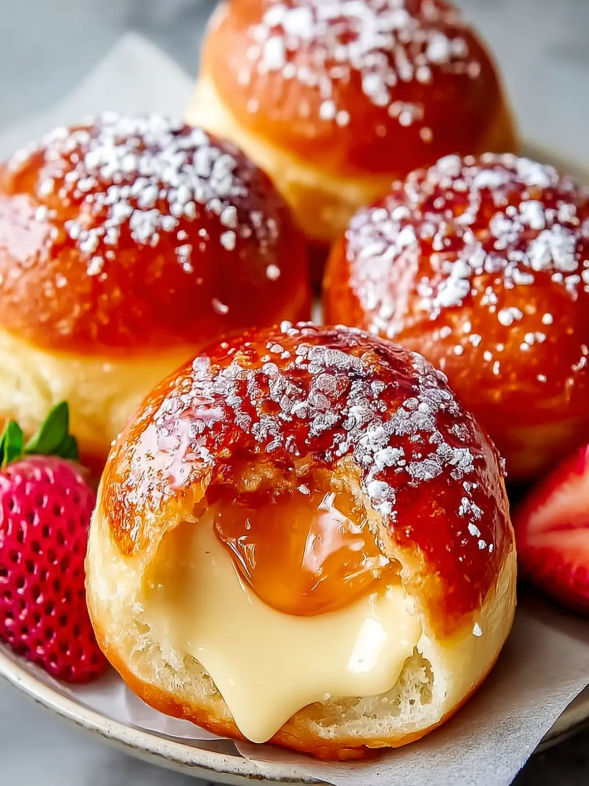 Delicious pastry cream filled donuts topped with a sweet glaze.