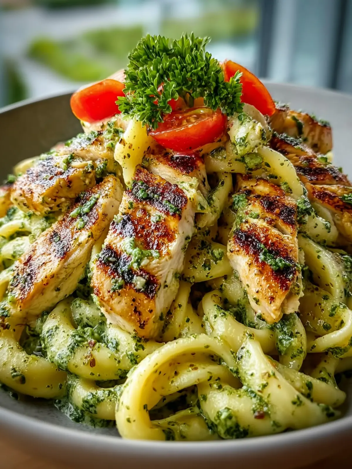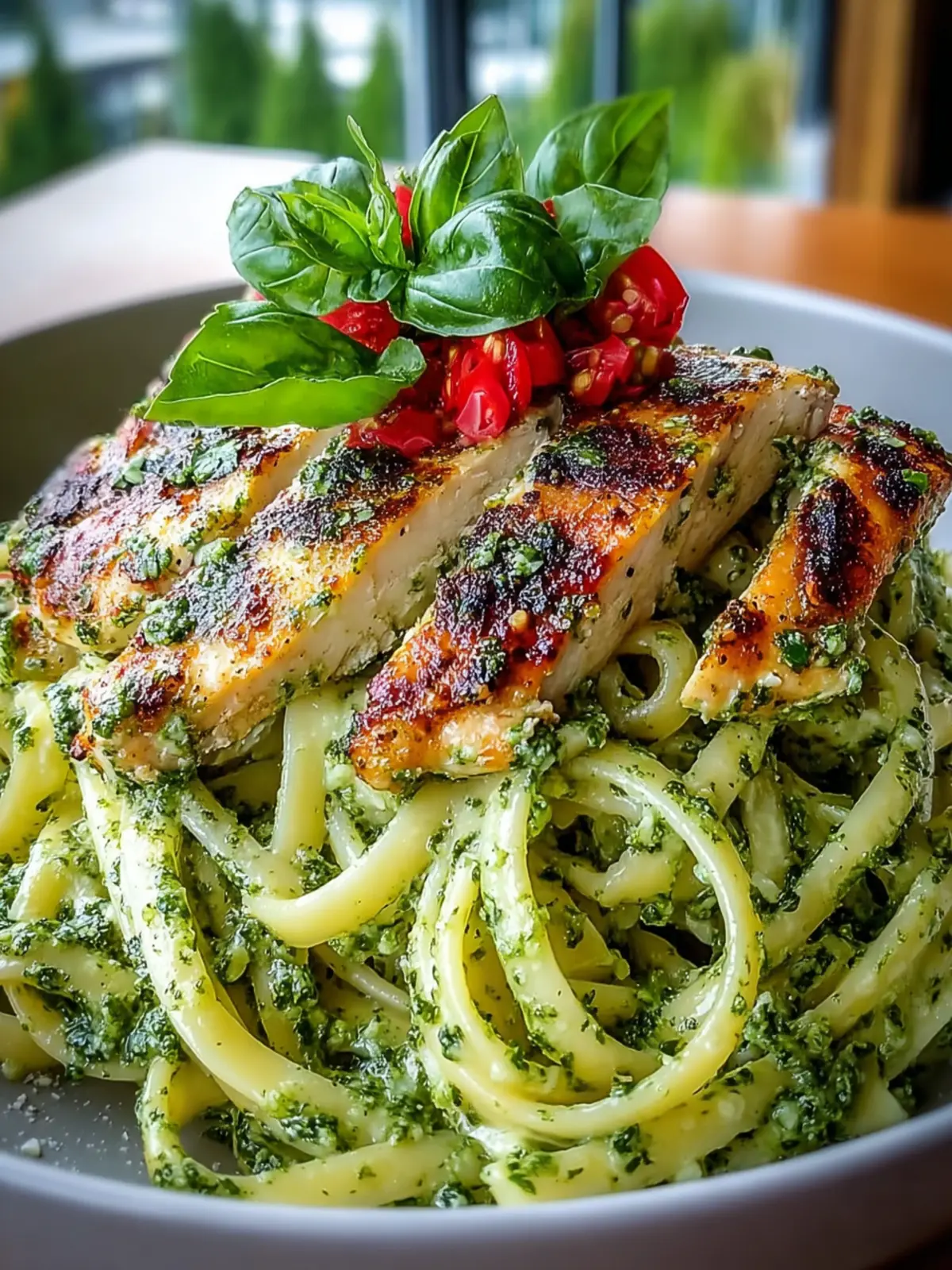 The base of this dish is made from freshly cooked chicken breast, which not only provides lean protein but also serves as a beautiful canvas for the vibrant flavors of the pesto.