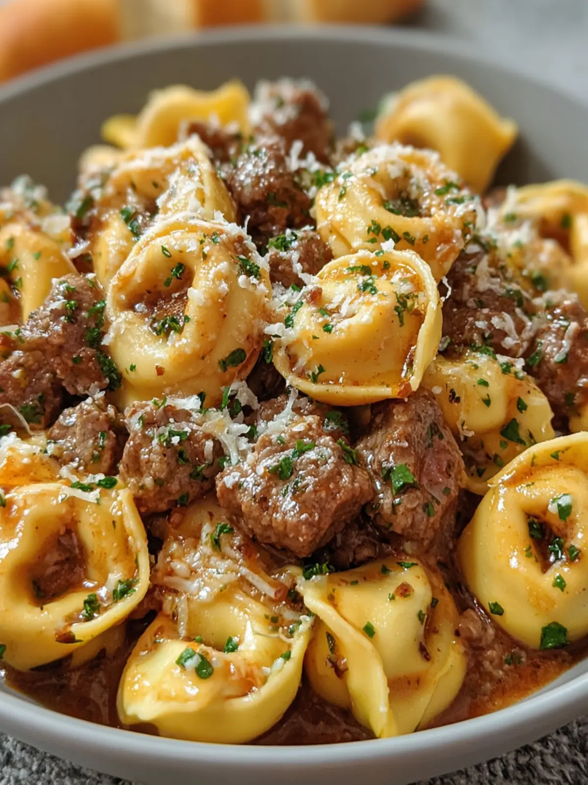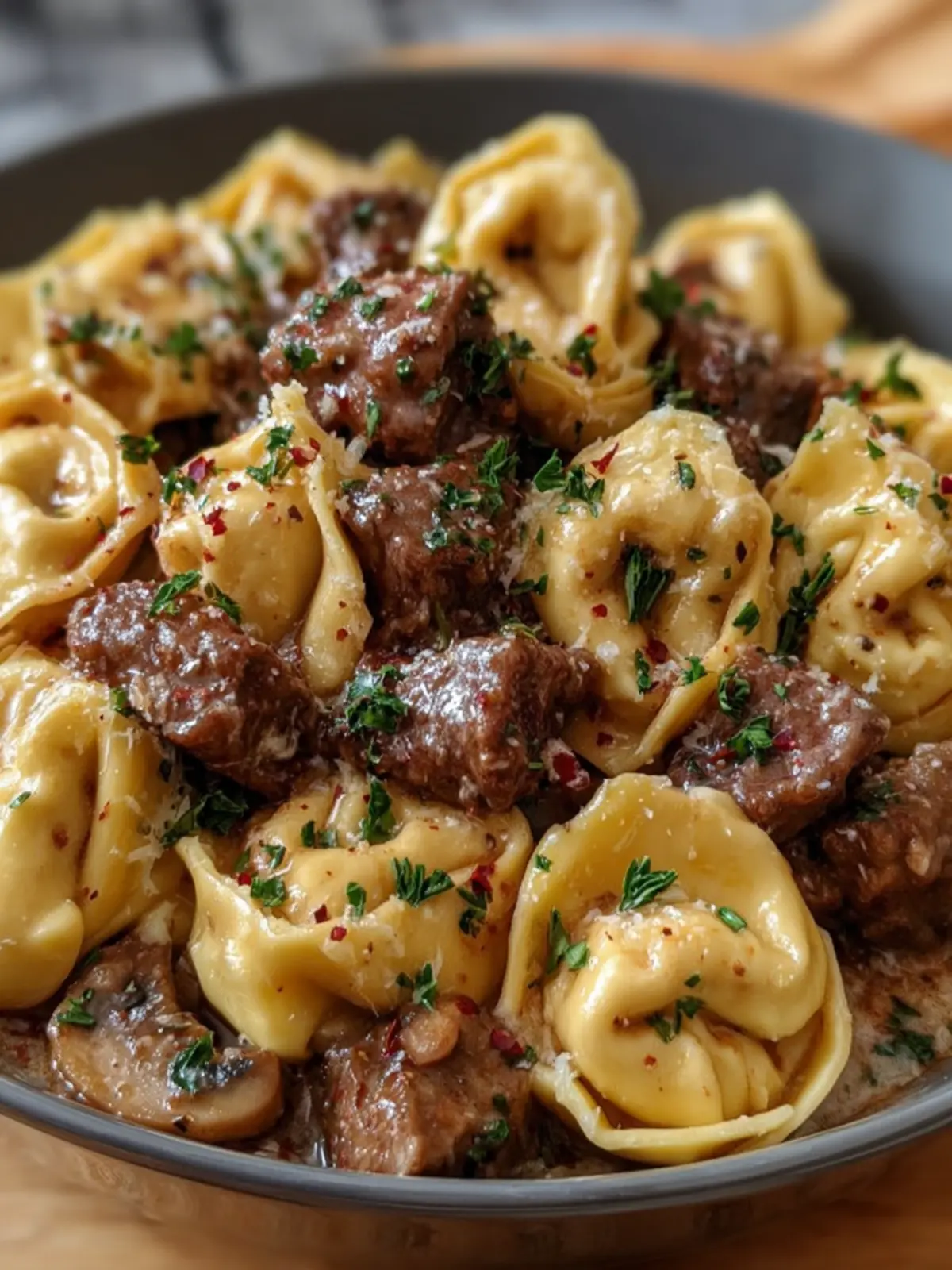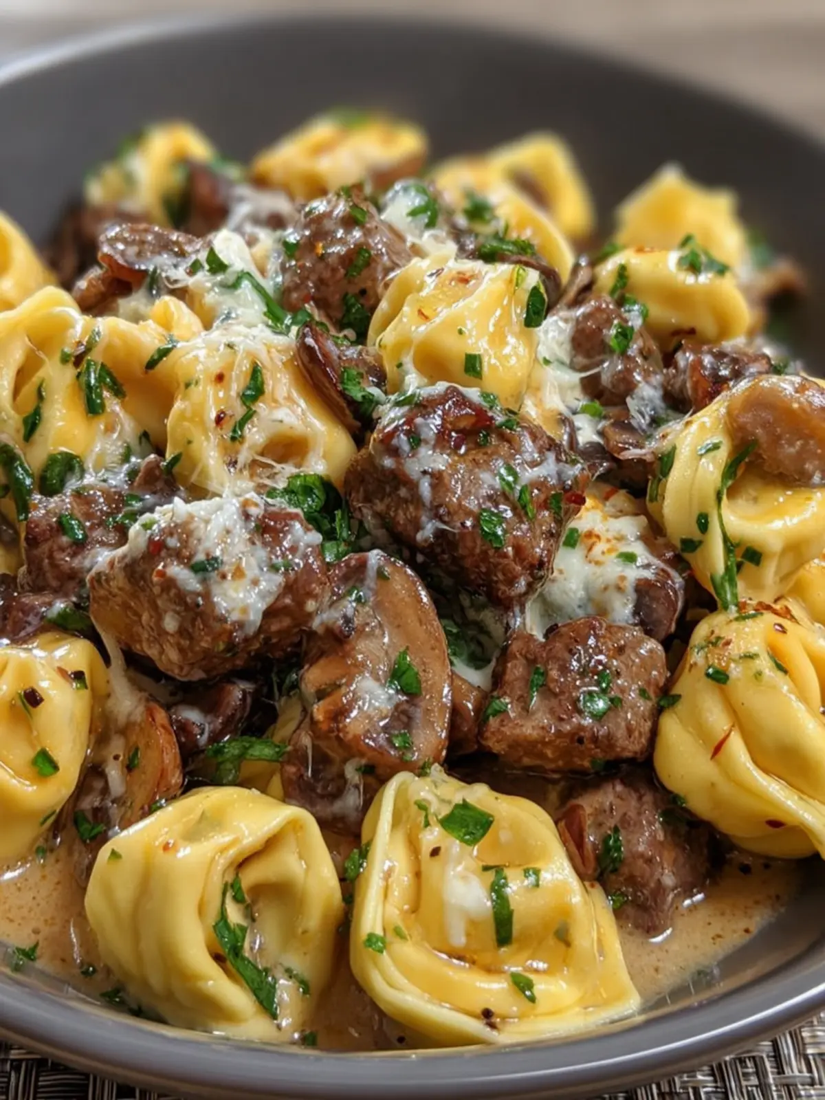 A delicious and creamy beef and mushroom tortellini dish that is perfect for dinner.