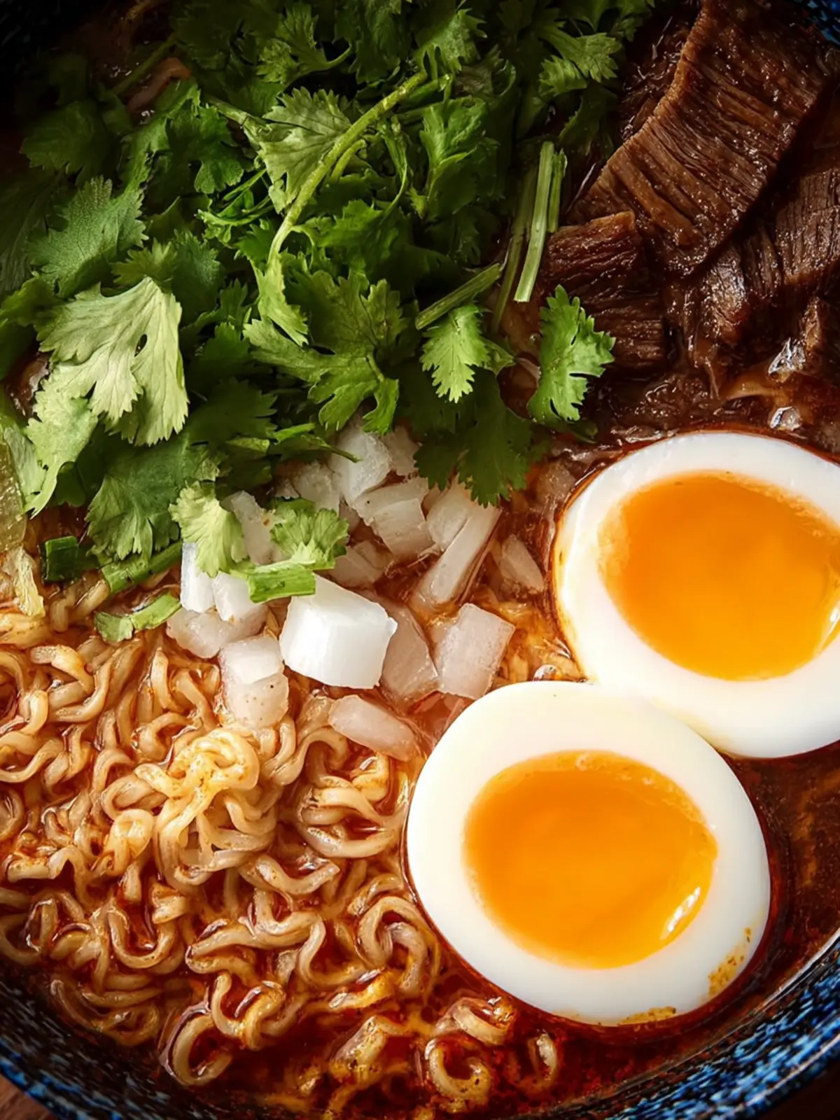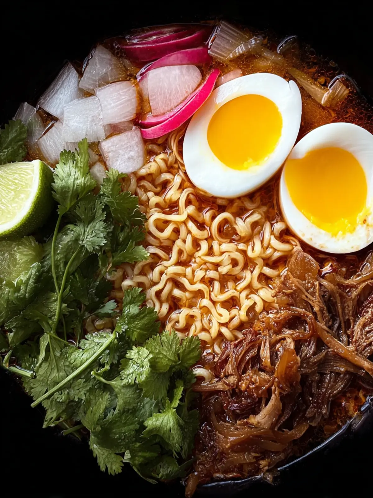 Toppings: Don’t forget the garnishes! Fresh cilantro, diced onions, lime wedges, and sliced jalapeños add brightness and crunch, balancing the richness of the ramen perfectly.