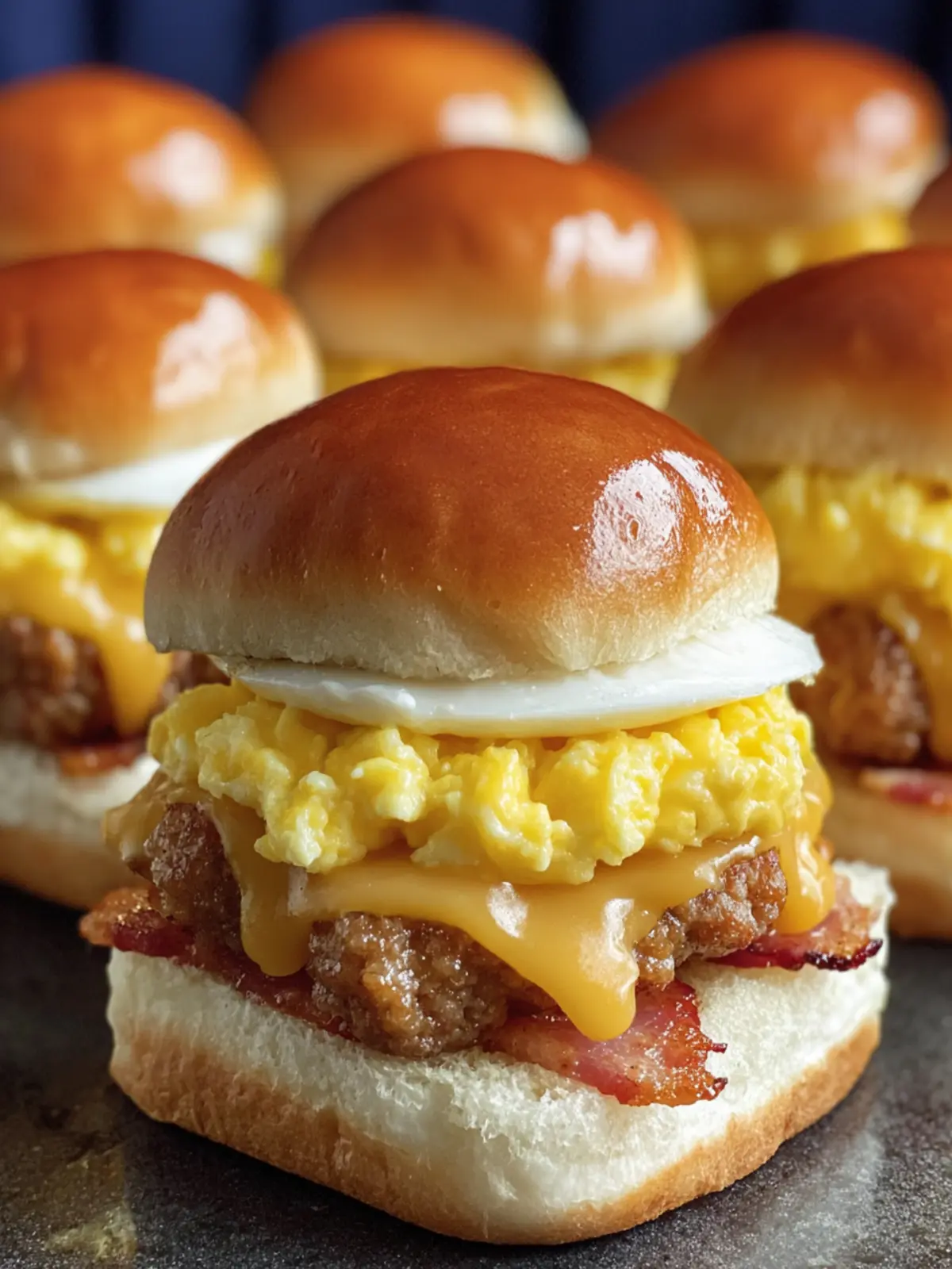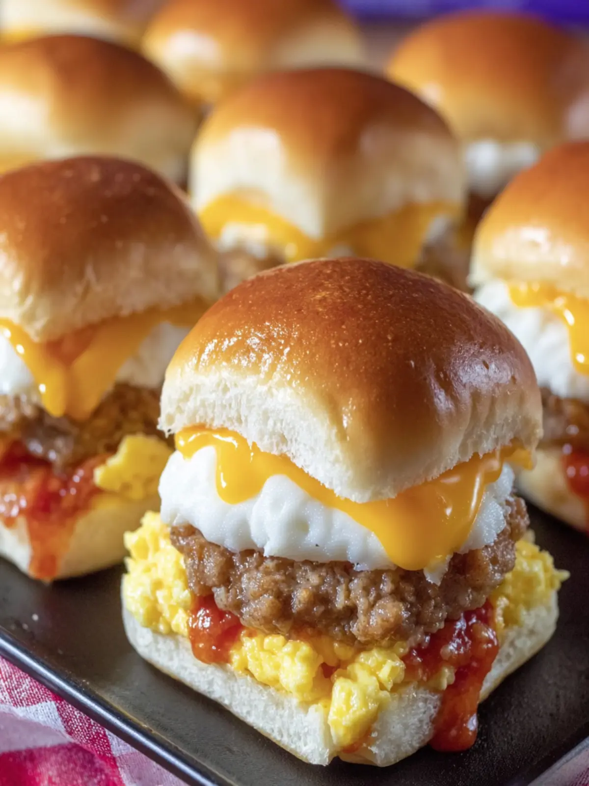 A delicious and easy-to-make breakfast slider that combines savory sausage, scrambled eggs, and melted cheddar cheese, all served on soft slider buns.