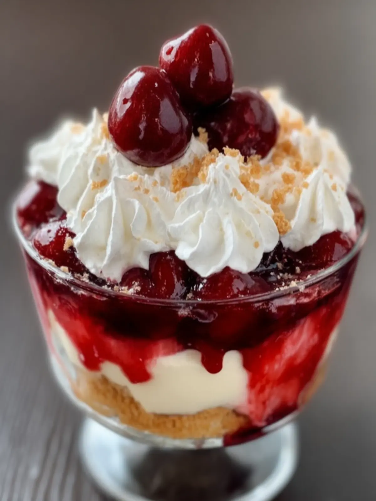 - Assemble the Trifle: In a trifle dish, start with a layer of crushed graham crackers. Spoon a layer of the cream cheese mixture over the graham crackers. Add a layer of cherry pie filling over the cream cheese mixture. Repeat the layers until all ingredients are used, finishing with a layer of cherries on top.