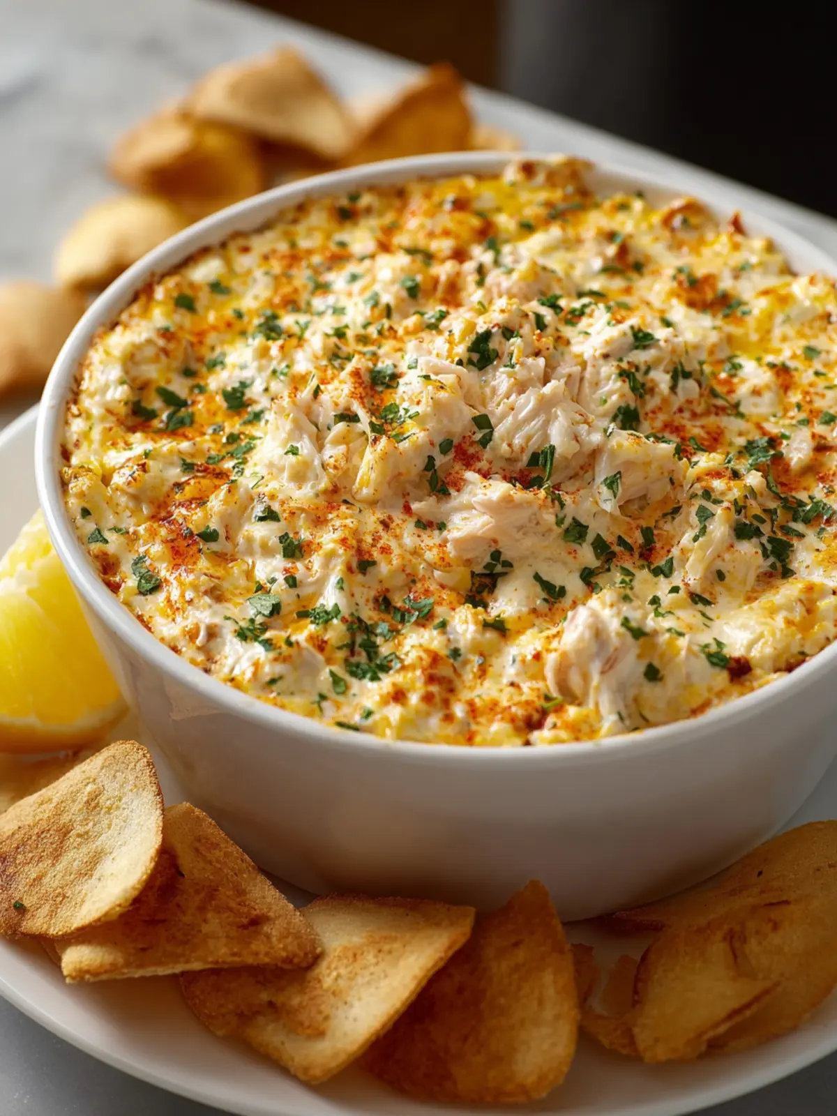 A deliciously creamy dip packed with flavors of crab and cheese, perfect for a party or a snack.