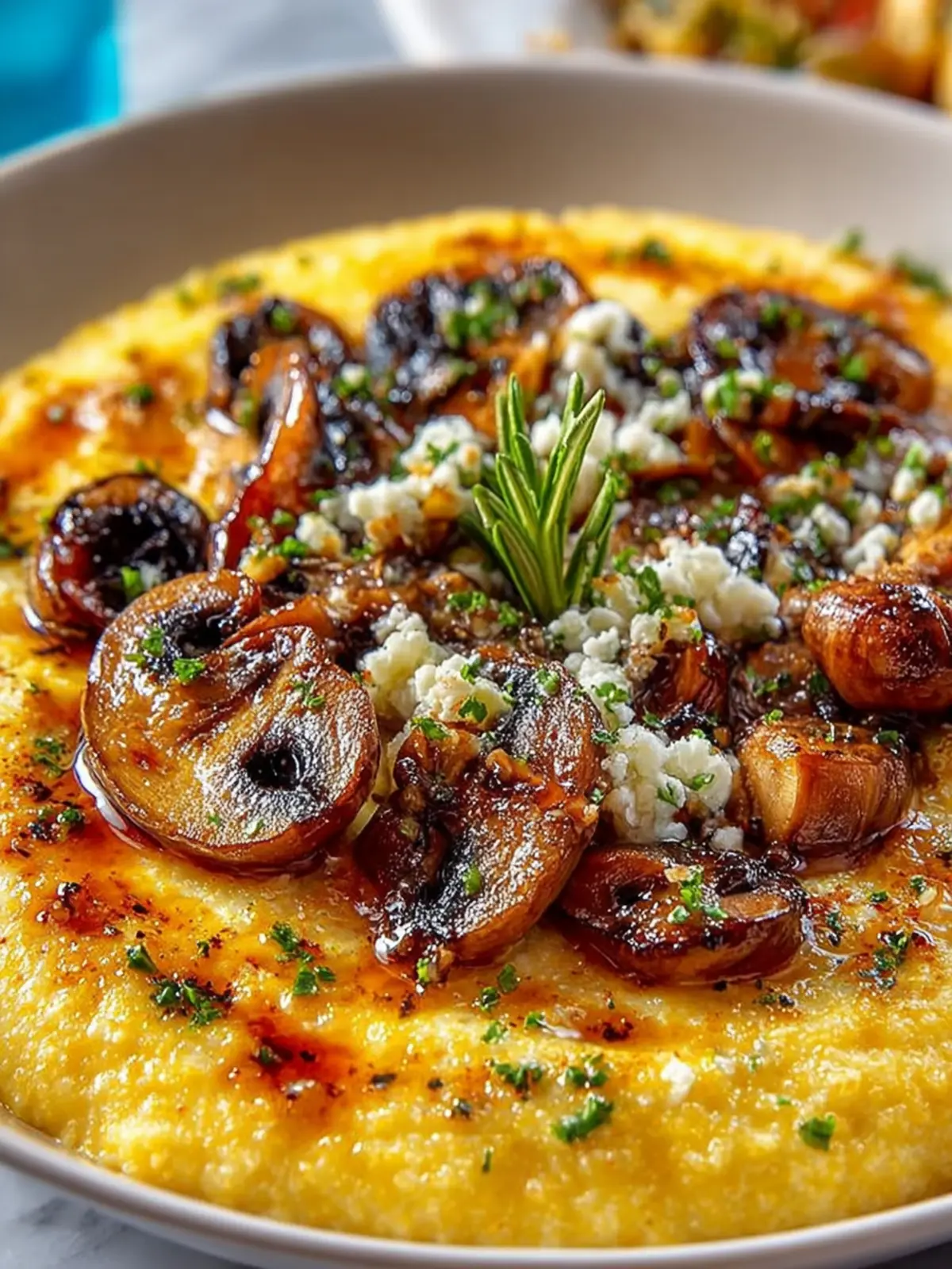 - Spoon creamy polenta into bowls and top with sautéed mushrooms.