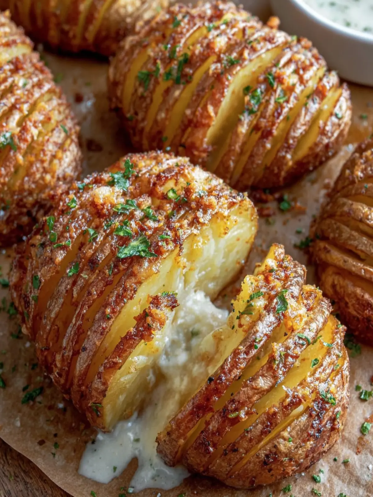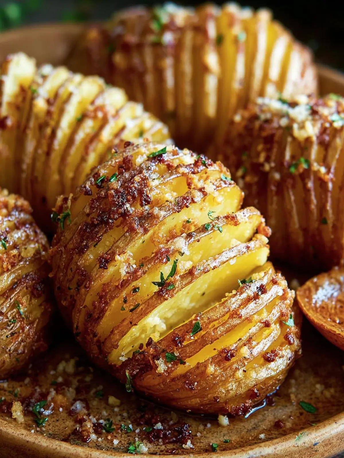 Deliciously crispy Hasselback potatoes infused with fresh herbs and garlic.
