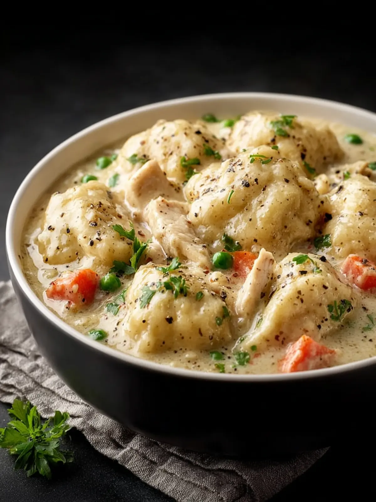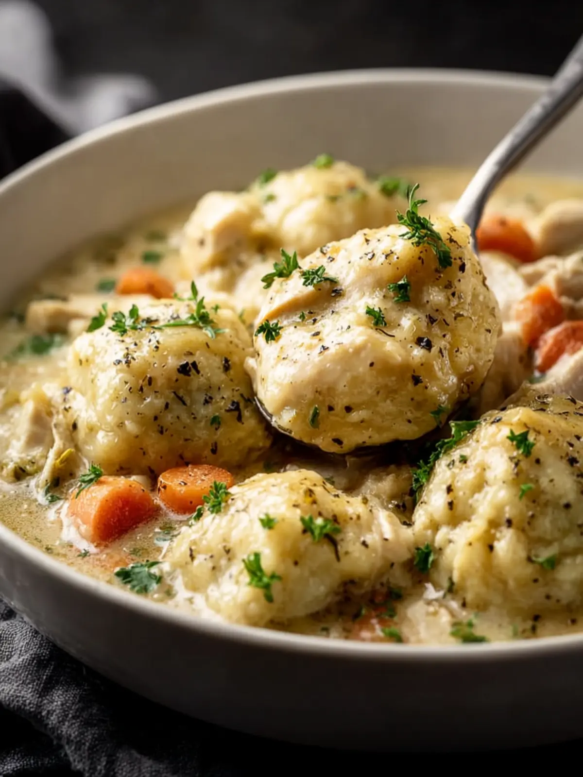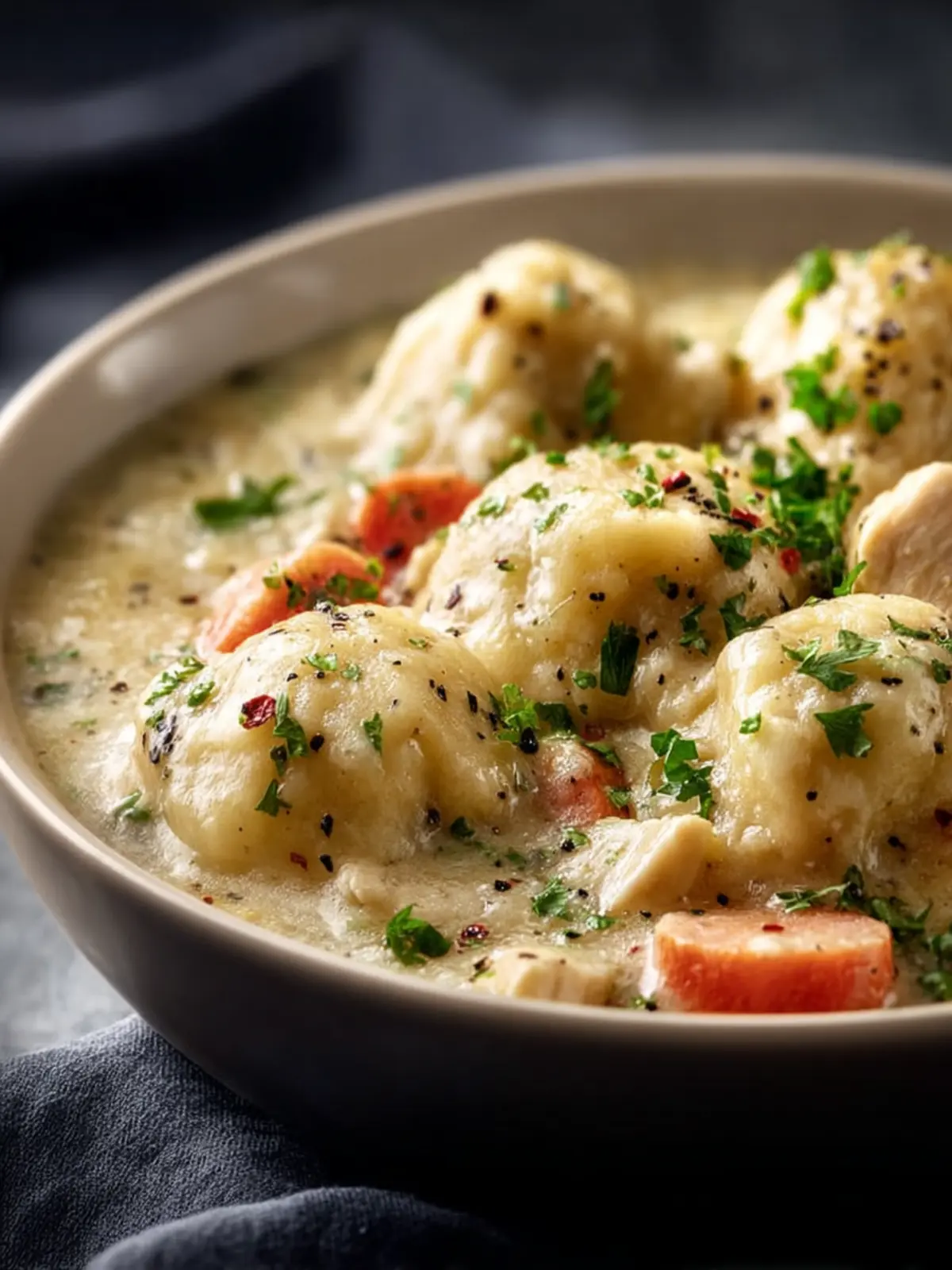 A hearty and comforting meal made with chicken, vegetables, and fluffy dumplings, perfect for a cozy dinner.