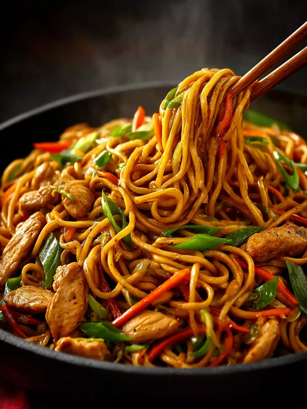 This delicious Lo Mein Chicken Stir-Fry is quick and easy to make, featuring tender chicken, colorful vegetables, and a savory sauce.