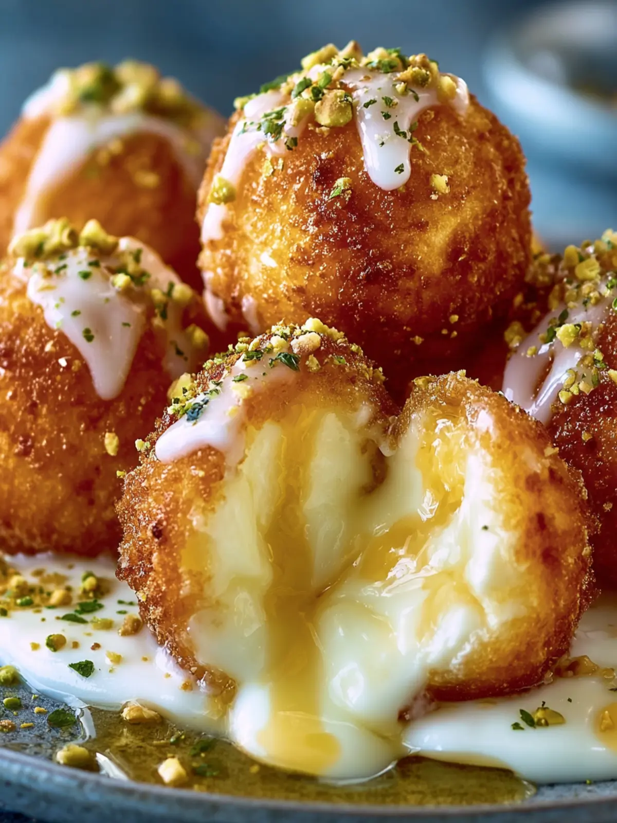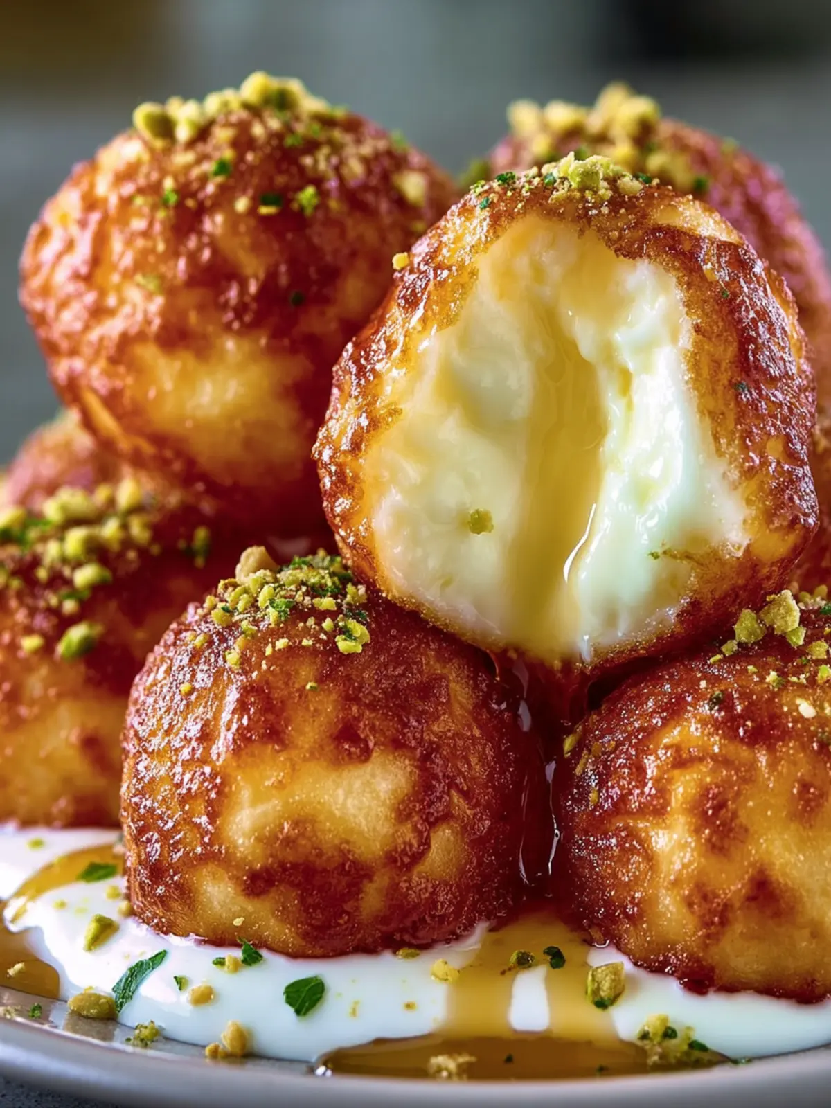 Delicious fried sweet cheese balls drizzled with honey and topped with pistachios, perfect for a dessert or a snack.