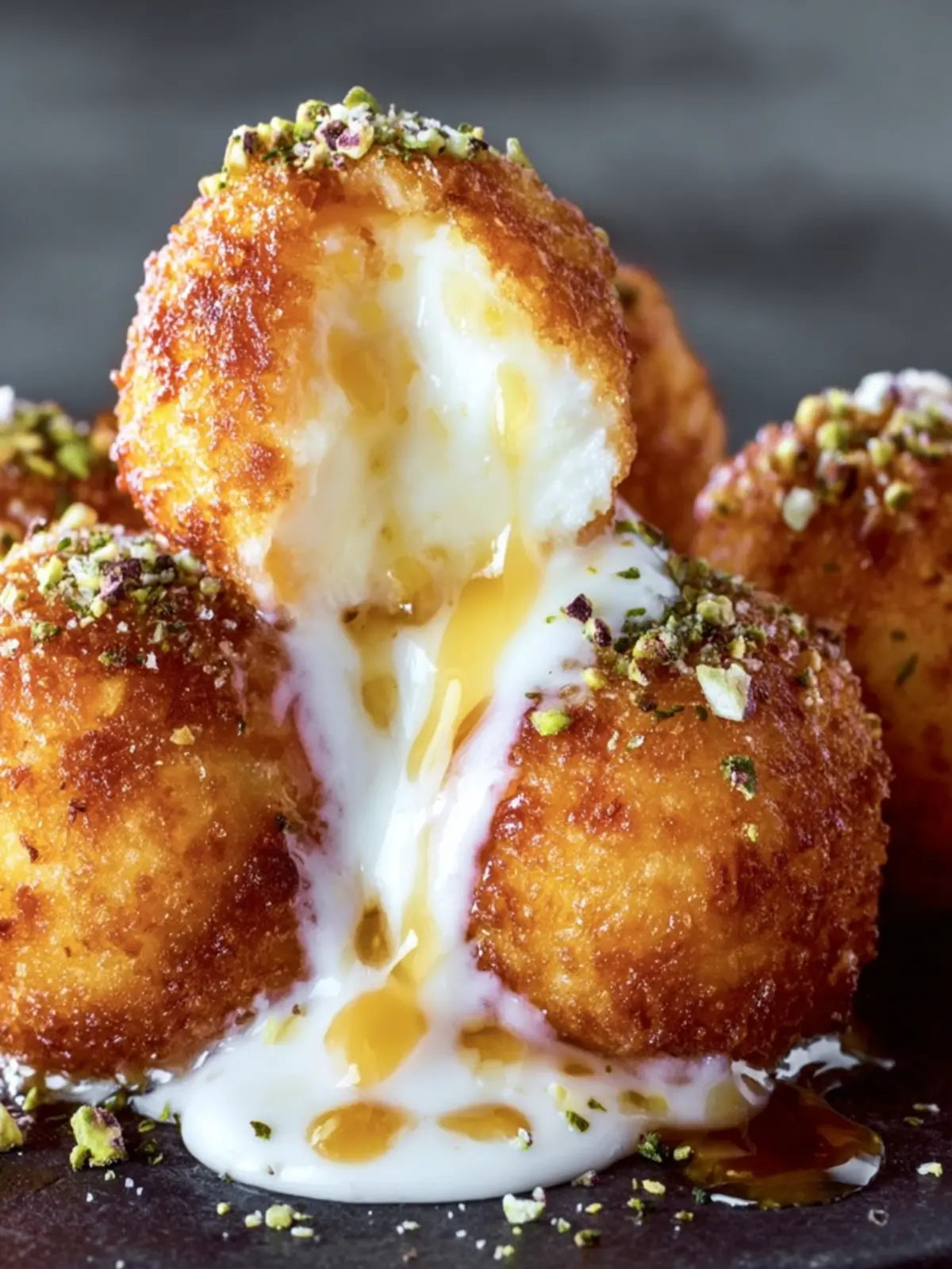 Add Toppings: Arrange the fried cheese balls on a serving plate. Drizzle generously with honey and sprinkle chopped pistachios on top for garnish.