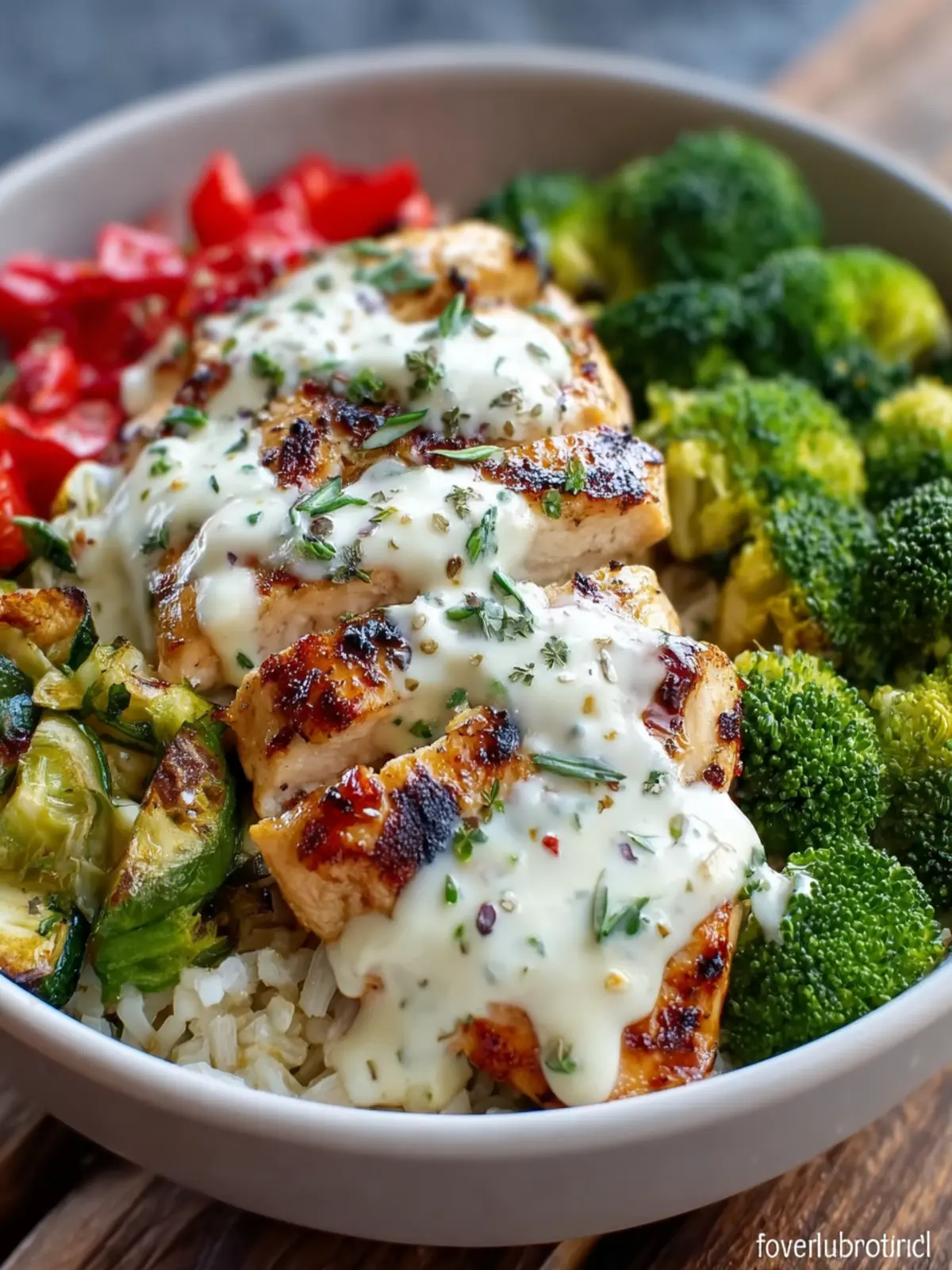 A delicious and healthy bowl featuring grilled chicken, broccoli, and a creamy garlic sauce served over brown rice.
