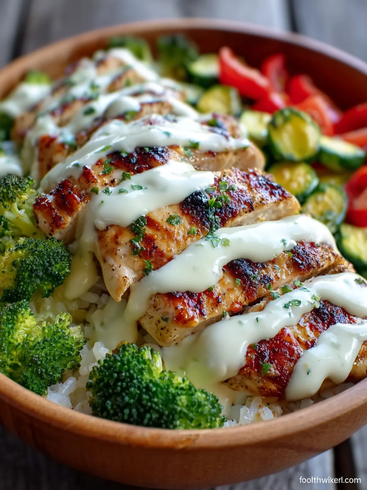 - Assemble bowls by dividing cooked rice among 4 bowls. Top each with sliced grilled chicken and broccoli. Drizzle with creamy garlic sauce and serve.
