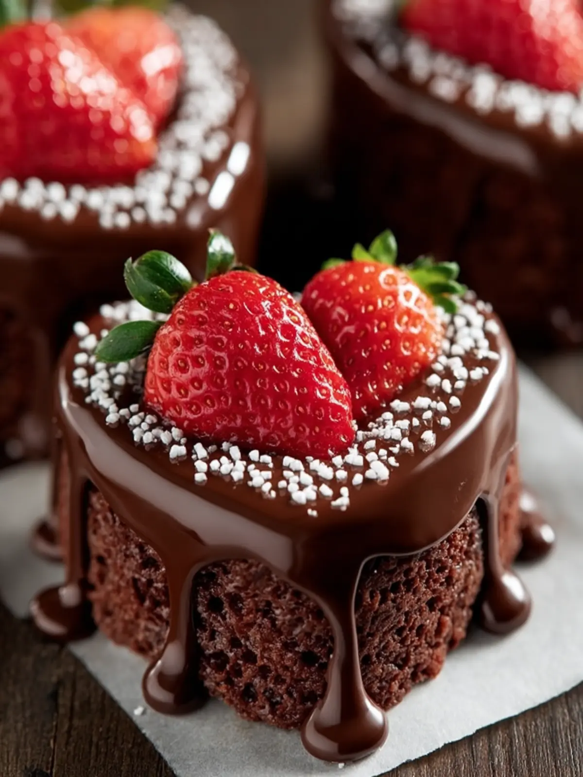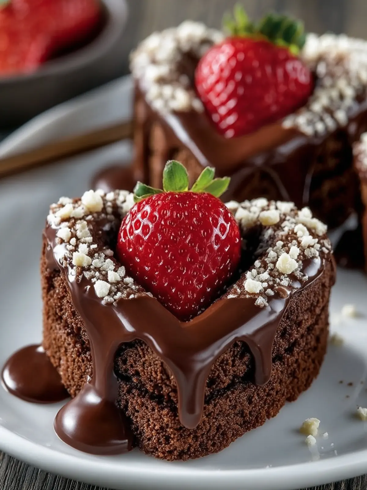 Enjoy these delightful heart-shaped chocolate cakes topped with luscious strawberries for a romantic or festive treat!