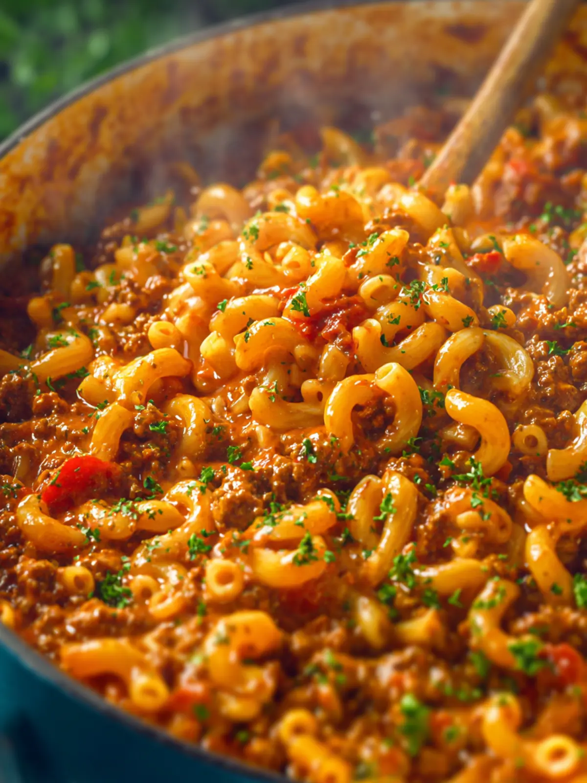 A comforting one-pot meal combining macaroni, ground beef, and cheese.