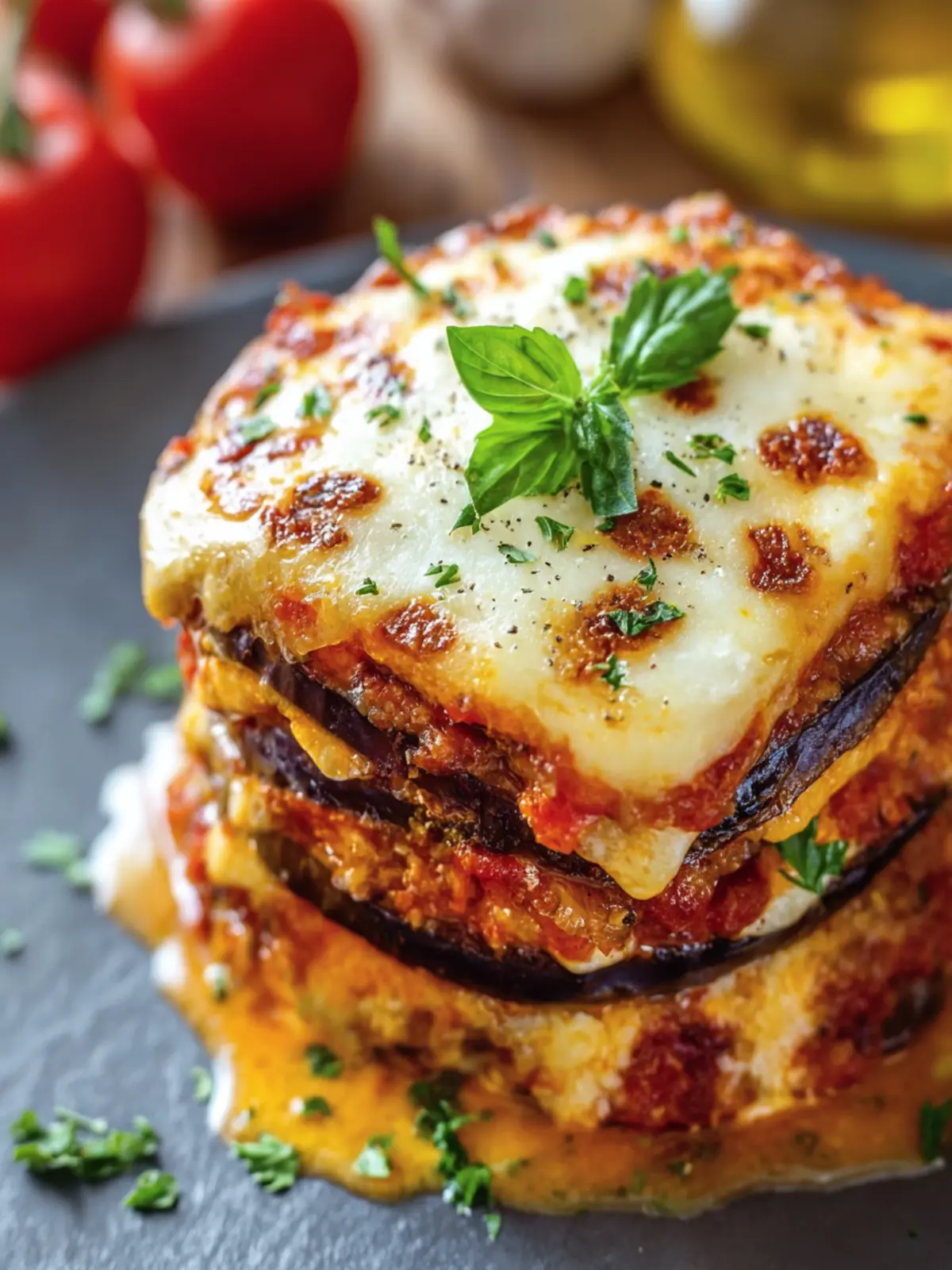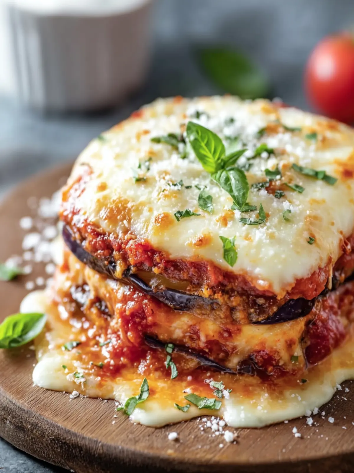 A rich and hearty dish of layered eggplant, marinara sauce, and cheese.