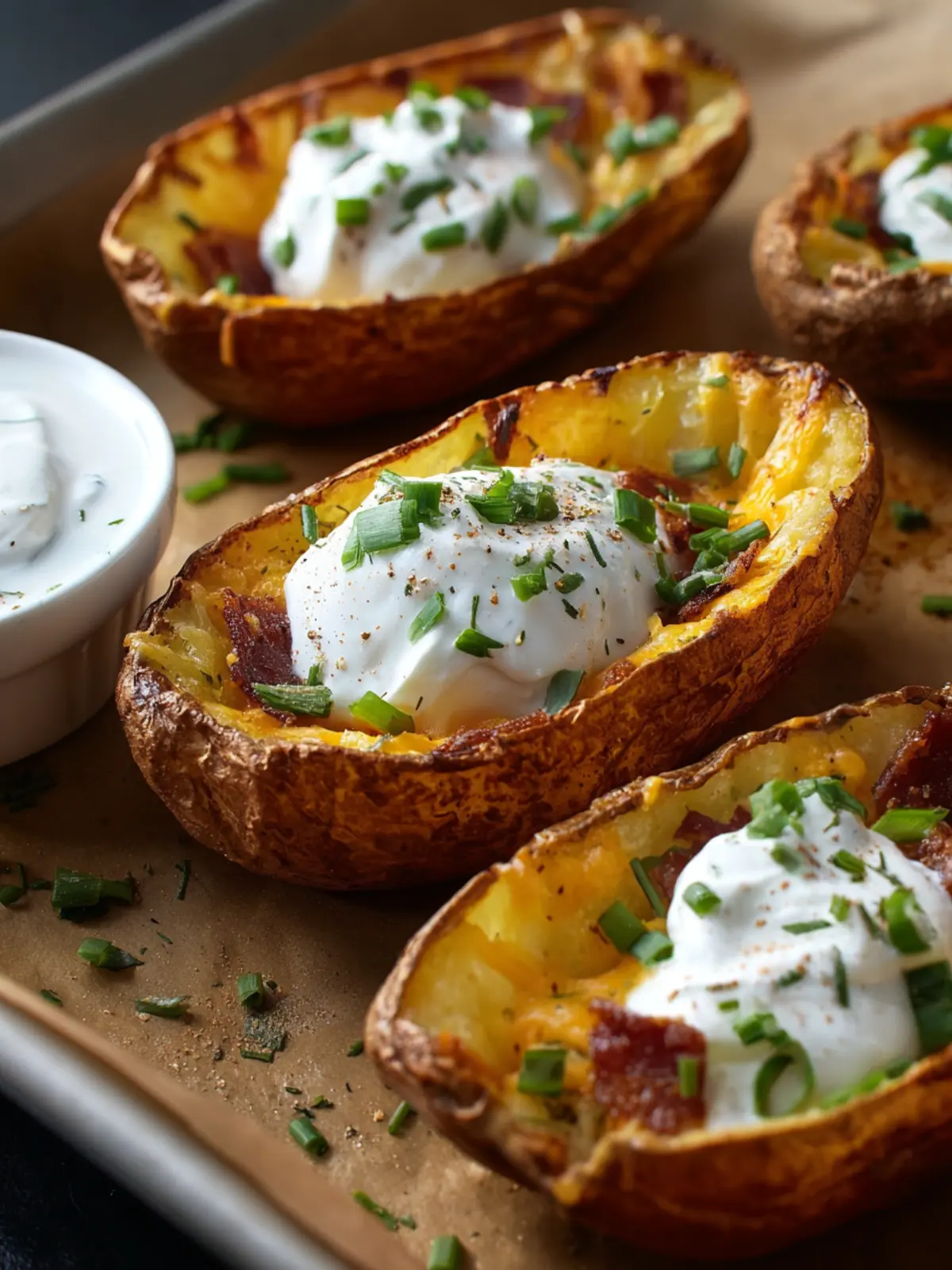 Deliciously crispy potato skins filled with creamy sour cream, cheese, and herbs.