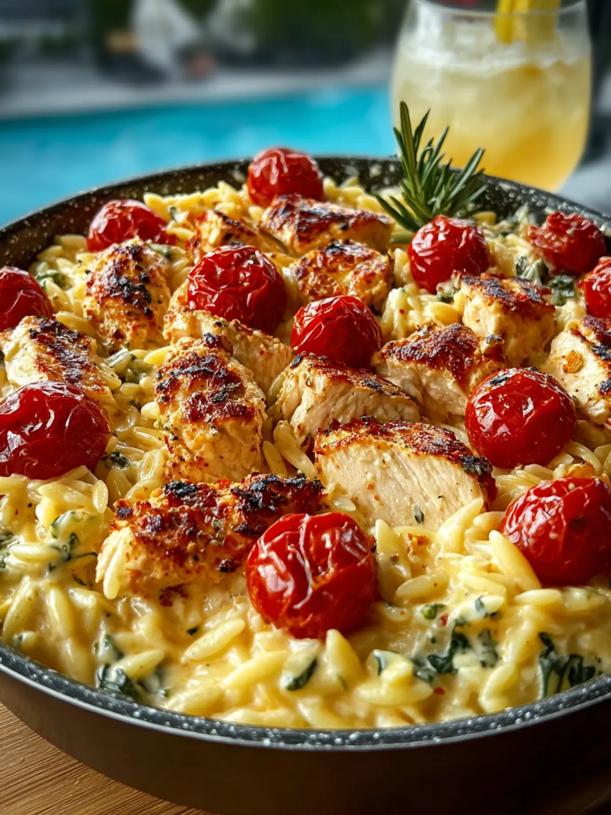 A delicious and creamy one-skillet dish featuring chicken, orzo pasta, sun-dried tomatoes, and a rich sauce.