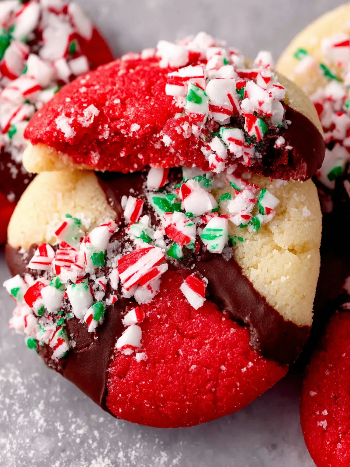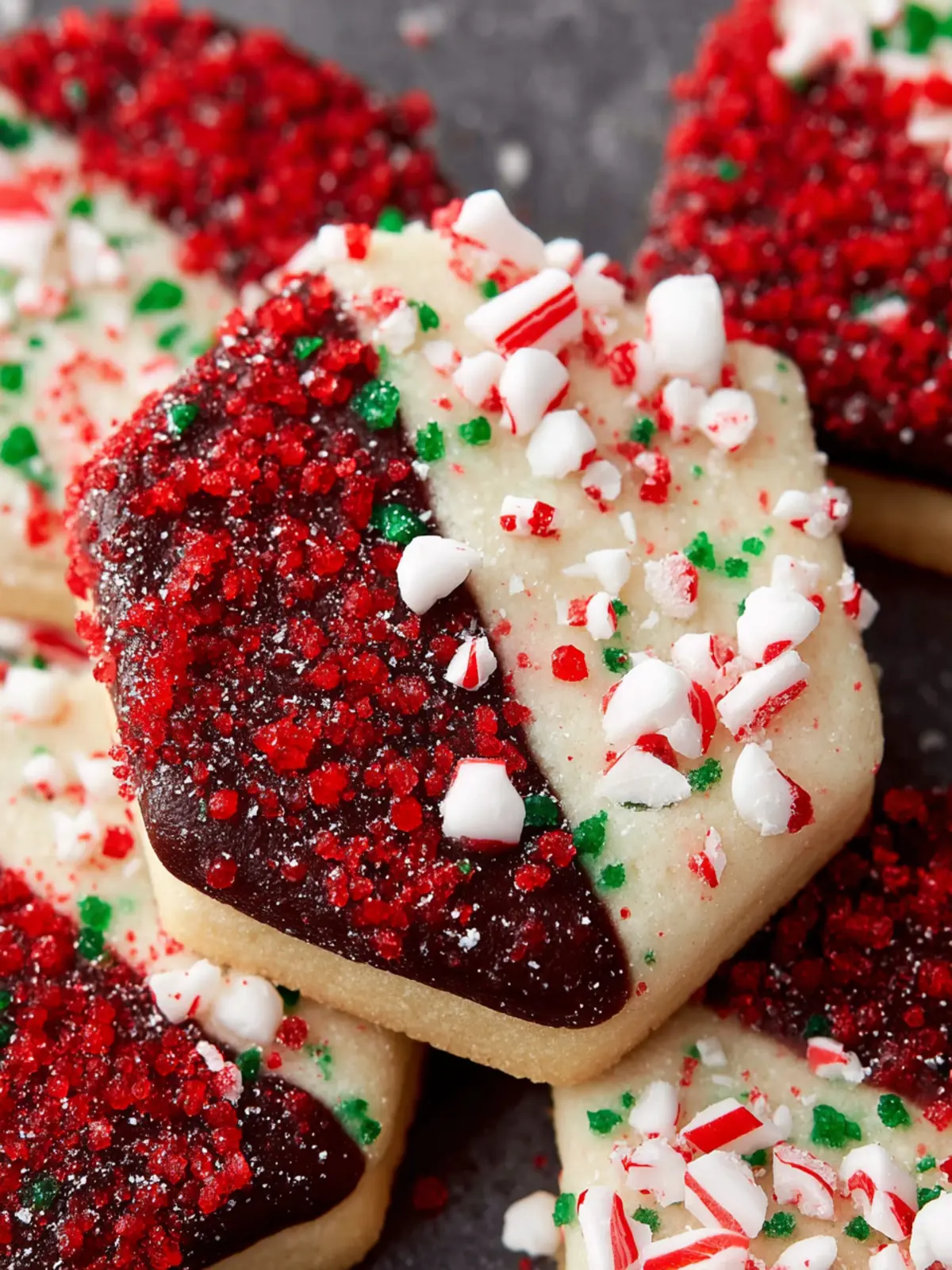 These colorful cookies are perfect for the holidays! Soft and buttery, they are dipped in chocolate and sprinkled with candy canes for a festive touch.