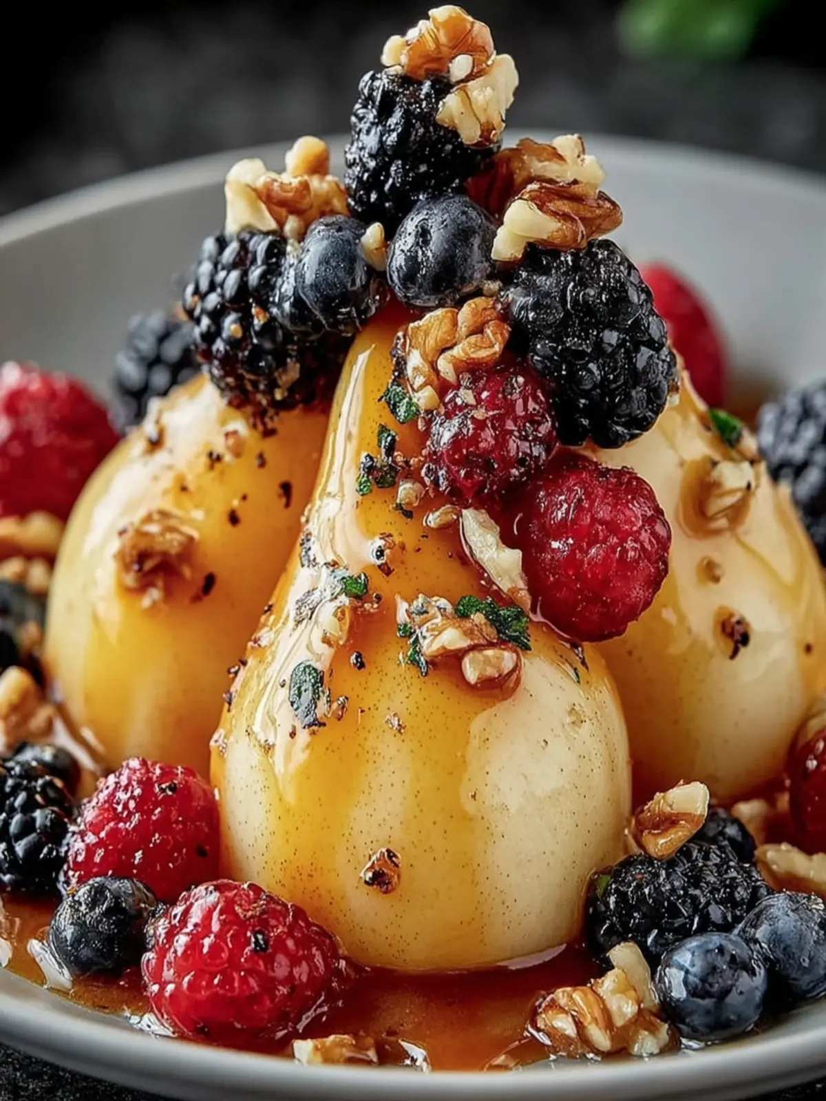A delightful dessert featuring tender poached pears, mixed berries, and toasted walnuts, perfect for any occasion.