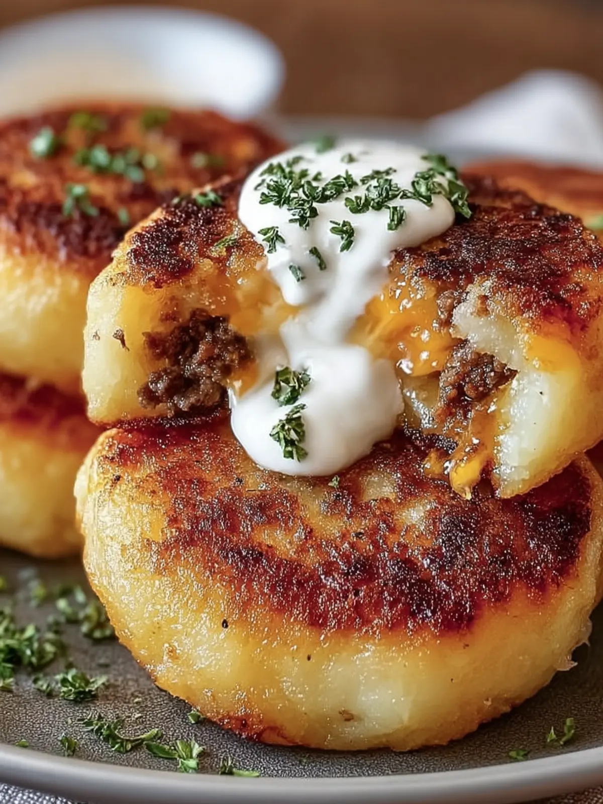 Delicious savory stuffed pancakes made with mashed potatoes and filled with a savory ground beef mixture, perfect as a main dish or snack.