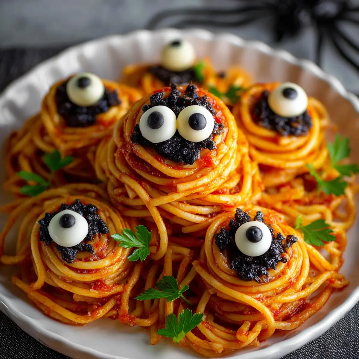 - Place a meatball “eyeball” in the center of each spaghetti nest.